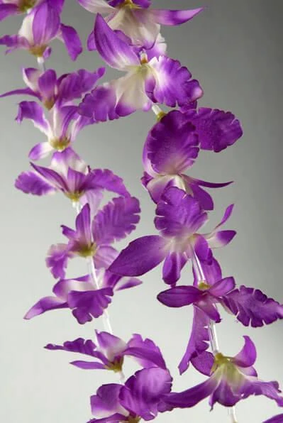 These lovely leis feature artificial purple and white orchid flowers that are made of a poly silk blend. String two leis together for chair back decorations at a wedding reception. Incorporate several into an archway. You can even remove the flowers for use in luau or tropical decorations by cutting the lei’s cord. Add an exotic touch and tropical flair to any setting with these faux Purple Orchid Flower Leis!