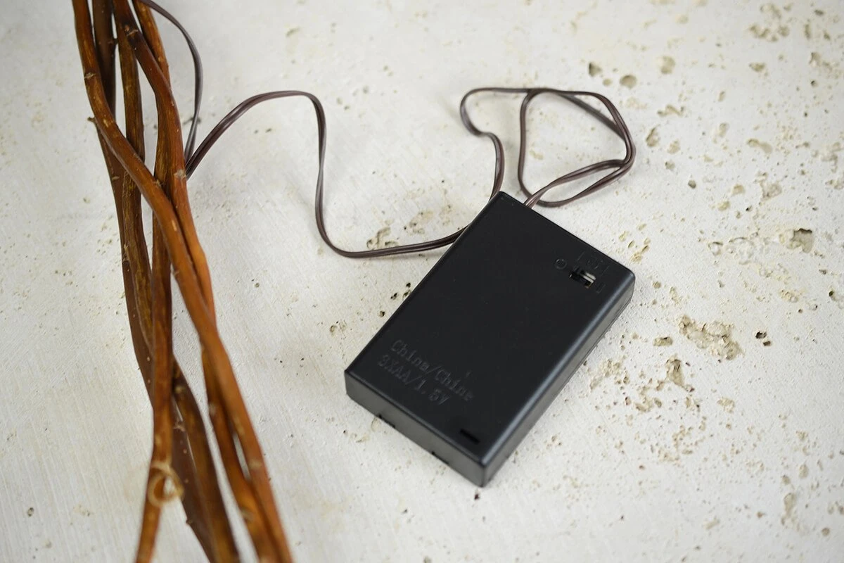 This is a bundle of five natural willow branches that are 39″ tall. They have 50 warm white LEDs and are battery powered (3 x AA batteries/not included) There is a three-way switch where you can chose off, on, and timer (6 hours on, 18 hours off.)