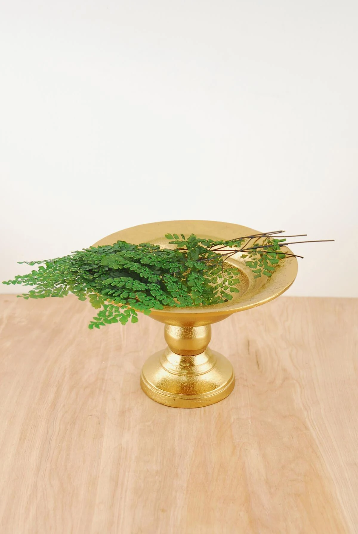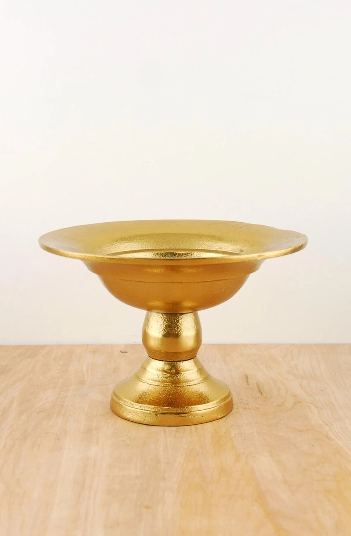 Elevate your floral arrangements with this Bowl Pedestal Metal Gold Compote. This glamorous metal bowl with brushed gold finish and elegant shape measures 5.25″ tall and will beautifully display flowers and bunches of greenery. The pedestal bowl measures 8″ across and makes a stunning accent piece for a wedding welcome table, reception table, or upscale, mixed metallic event. The gold compote has a rough, stippled finish overall with some polished patches.