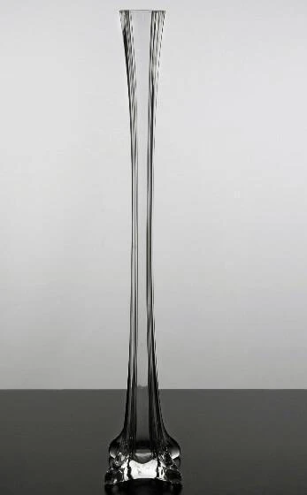 The Clear Glass Eiffel Tower Vase stands 20″ tall, with a top diameter measuring 1.75″. The narrowest (inside) diameter is 1″ wide. The base measures 3-5/8″ square.