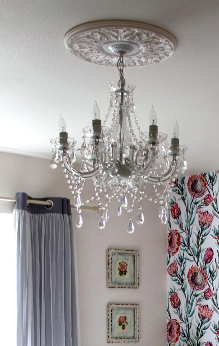 Decorate your home or special event with this stunning Crystal Chandelier. The chandelier measures 23″ tall overall and 19.25″ wide. It’s perfect for hanging from an arbor at a wedding ceremony, or for adding an elegant accent to your home. The crystals and trim are made heavy acrylic while the middle piece surrounding the stem of the chandelier is glass. The chain of this piece is approximately 70″ long and to light the chandelier, six E12 bulbs (25 watt) are required. Photo from Kirsten at Bright Yellow Door on Instagram. This chandelier does not come with the ceiling medallion as seen the photo.