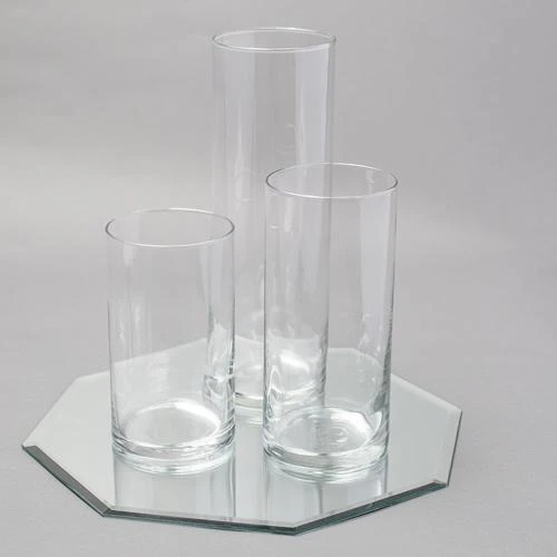 With this fabulous set of 3 Cylinder Vases and 1 Mirror, your table centerpiece is ready-to-go! Simply add florals, Richland® Pillar or Floating Candles, or other items of your choice to create your perfect theme. The thick, hand-blown, quality clear glass vases perfectly sit atop the beautifully reflective mirror to achieve a look that you and your guests will love. It’s never been easier to create your AMAZING!