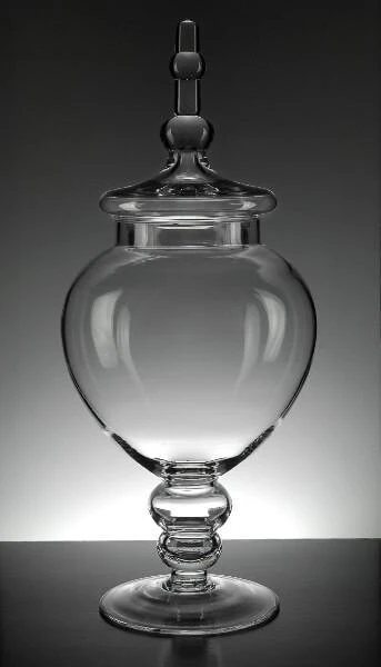 Fill this charming clear Glass Apothecary Jar 15.5” with candy or sweet treats at the favor station of your wedding reception or birthday party. Or, use the apothecary jar as an attractive storage container for your bathroom essentials such as cotton balls and small soaps. The small pedestal and unique-shaped lid of this piece creates instant elegance in any setting.