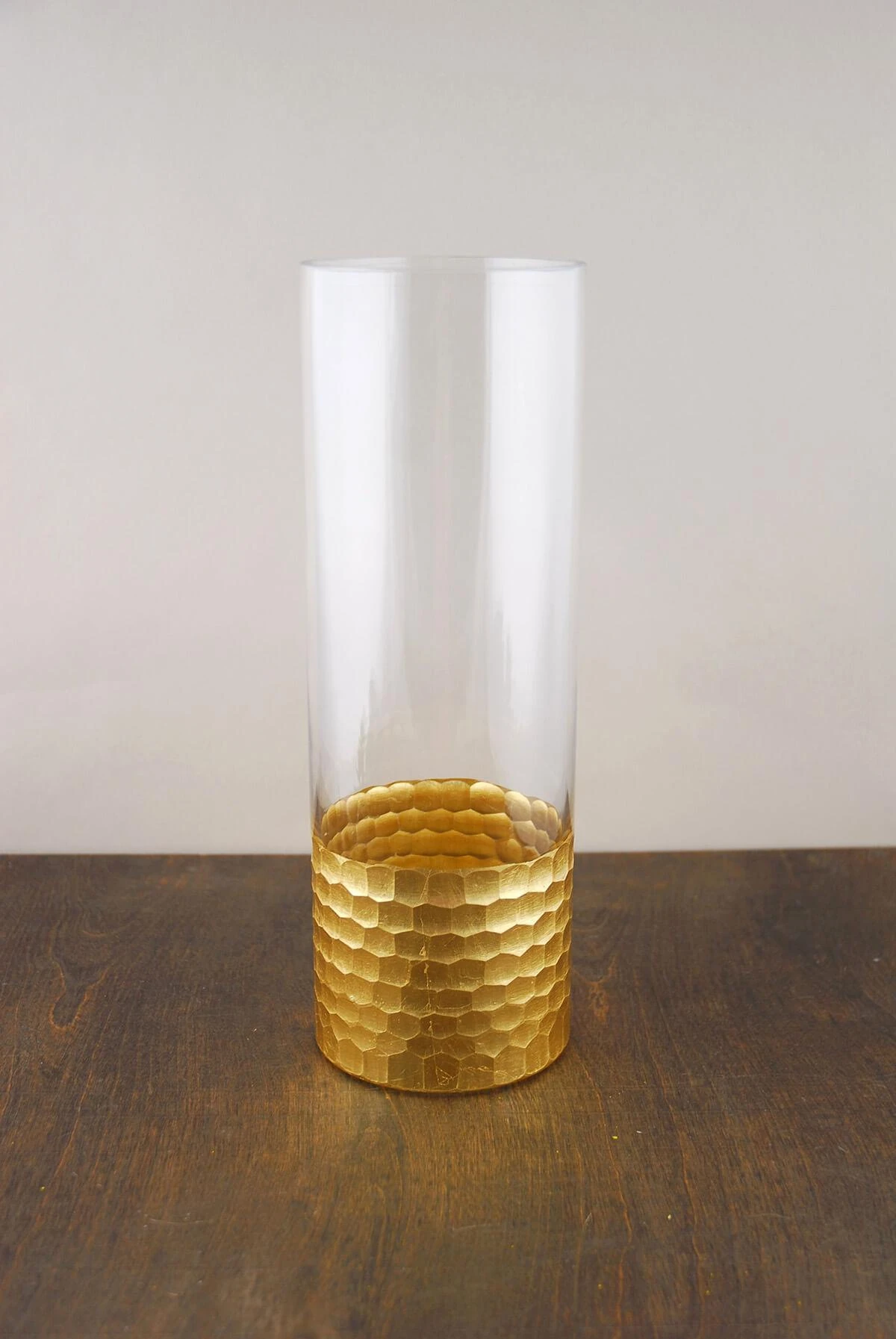 You will love this gorgeous Gold Honeycomb Cylinder Vase 12″. This versatile piece is perfect for flower arrangements or for use as a pillar or floating candle holder! This clear glass cylinder vase has contemporary styling with a dimpled honeycomb pattern around the base. This glamorous gold-dipped vase is great choice for weddings and special events; or as a lovely accent piece in your upscale home!