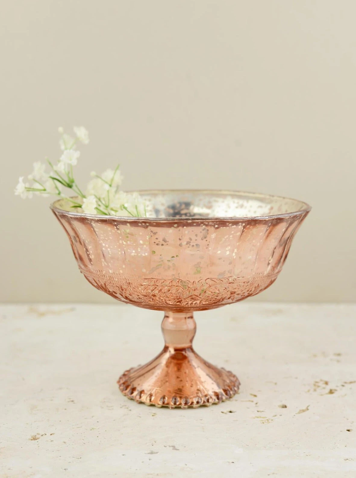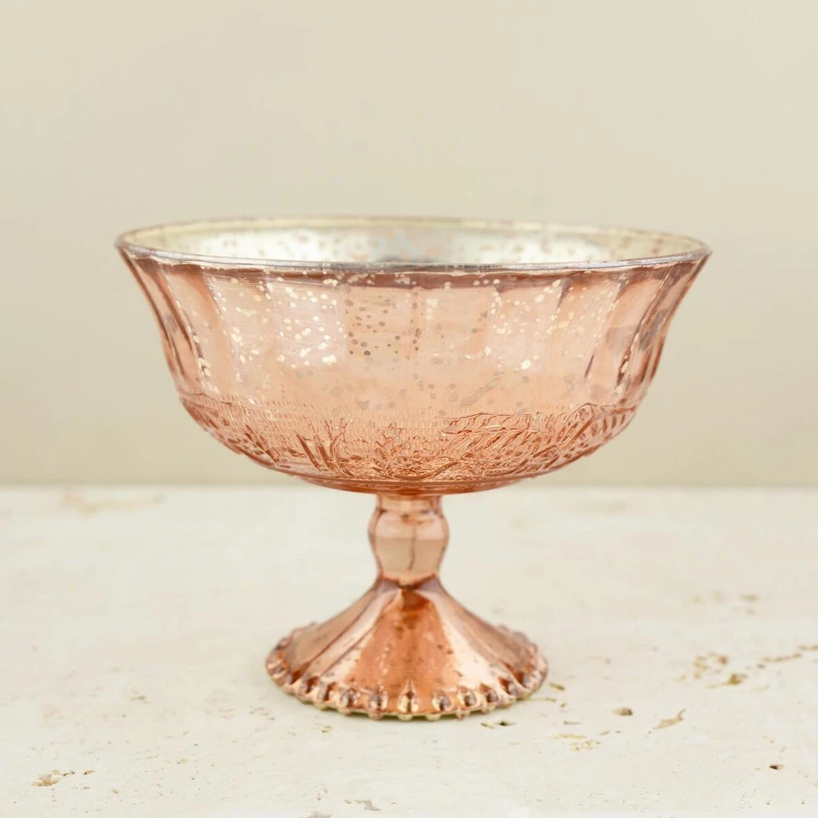 Showcase your floral arrangements in this striking Mercury Glass Compote in Rose Gold 7×5.25! The blush pink/copper mercury style finish compote with silver interior features a slightly scalloped top and beaded detail around the base. This elegant glass compote is coated on the inside with metallic paint to give it a speckled appearance that is perfect for accentuating vintage décor and glamorous events. Perfect for weddings, special events, and dinner parties!
