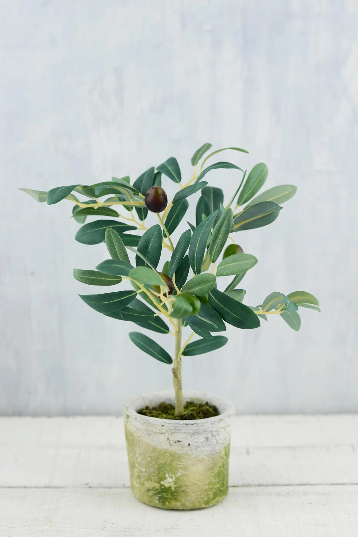 Decorate your table with this charming Mini Olive Tree. This petite artificial olive tree measures just 12″ tall . The decorative olive tree comes in a weathered, rustic shaped pot that is dusted with fake moss. The pot will vary in measurement, but is approximately 4″ wide at the top and 3.75″ at the bottom.