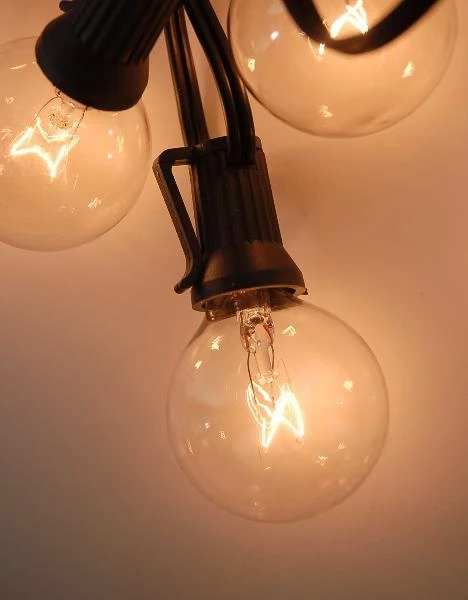 10 SOCKET OUTDOOR PATIO STRING LIGHT SET, G40 CLEAR GLOBE BULBS, 31 FT BLACK CORD W/ E12 C7 BASE Perfect to use to light Paper Lanterns also. Use for 12′ -24′ lanterns. Has 10 Clear G40 Bulbs 10 Sockets (36′ spacing) Black Cord (31.5′). Each socket has a 36′ inch spacing between bulbs with a 2′ lead cord on each end. Each C7 socket comes with a 5 watt clear bulb, each bulb is 1.5′ wide. Can be used for indoors or dry outdoor use, connect up to 3 sets of these lights together. Comes with end-to-end. UL Listed plugs.