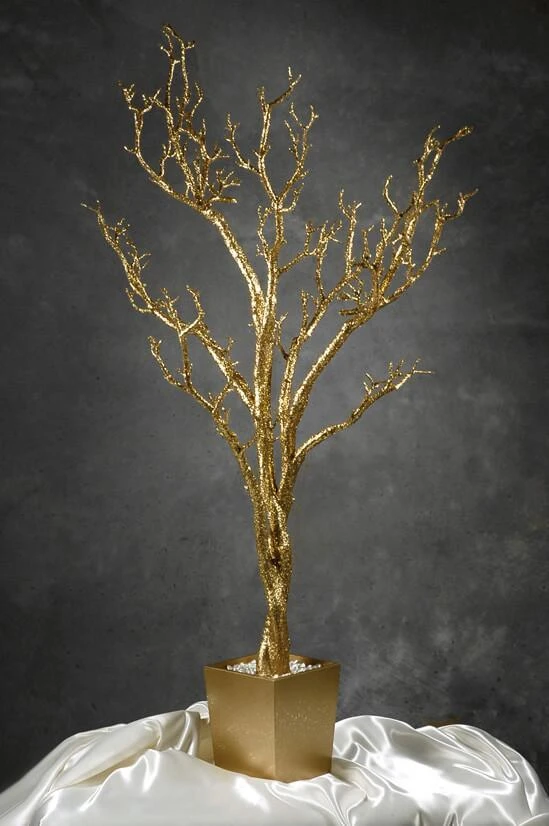 Create a dazzling display for your event, party, or wedding with this Potted Gold Faux Manzanita Tree! The wired branches of this artificial Manzanita tree are covered in gold glitter – giving instant glamorous shine to any setting. The sturdy base is enclosed by a square a shimmery gold-painted wooden pot; and topped with natural white stones. Use as-is for a simple yet stunning accent; or add fairy lights, crystals, or garland to fashion an impressive, dramatic aesthetic.