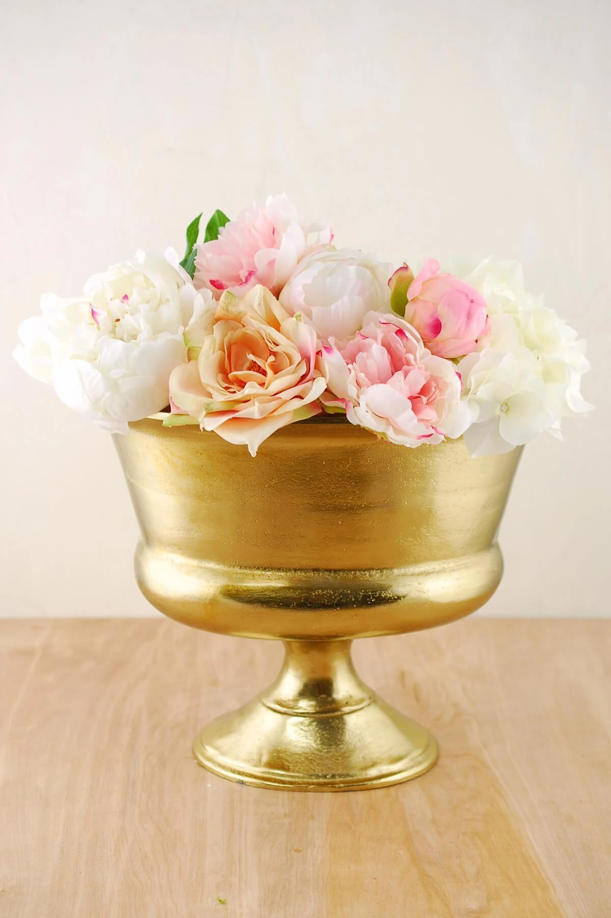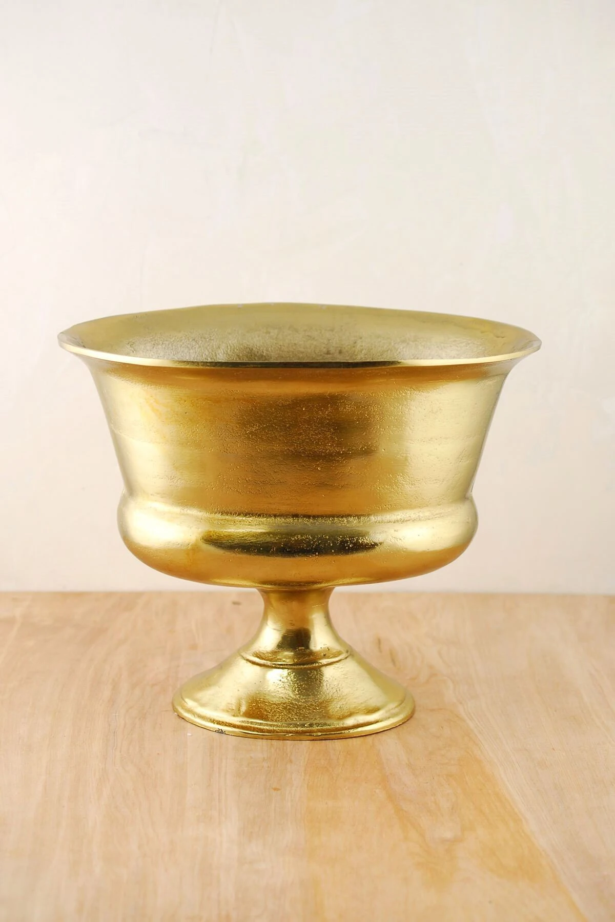 Perfect for Glam wedding! The graceful, Prestige Gold Urn is an essential accent to any lavish event. This compote vase is made of metal and features an added vintage style brushed gold finish. Fill this sturdy vessel with a rich display of yellow and ivory roses, orchids, or hydrangeas (not included). Mix classic style and intricate detail by pairing this slightly textured oval vase with and a lace table runner.