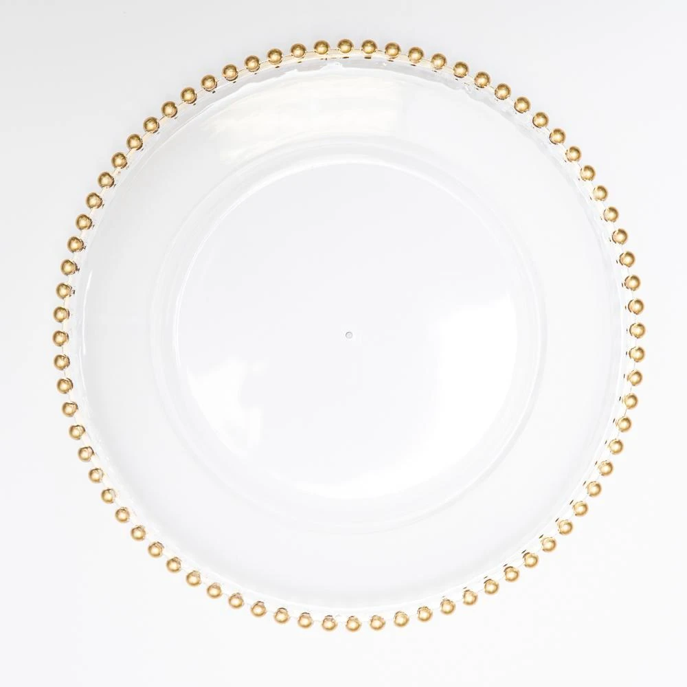 An alternative, lightweight version of our beloved beaded glass charger plates! This clear plastic charger plate with painted gold beaded trim is perfect for a variety of tablescape designs. This thick acrylic plate is a cost-effective way to give that elegant touch of class to your table settings. Available in gold or silver, this charger plate is sure to wow your guests. A safe and lovely choice to adorn the kids’ table at your wedding or bridal shower. Shop our full line of chargers for your own AMAZING!