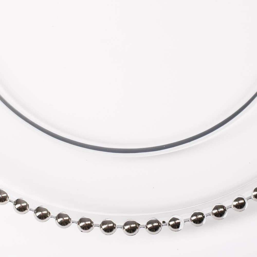 This customer favorite in our charger plate category is spectacular! This clear glass plate with silver painted beaded edging is simply stunning; and adds the perfect touch to your table. This charger plate is a great choice for those that might not want to use a traditional charger plate; but still have the sophisticated look. Not only are Charger Plates a beautiful and elegant addition to your table top, they protect your linens. Great in any setting – use for weddings, parties, and special events!