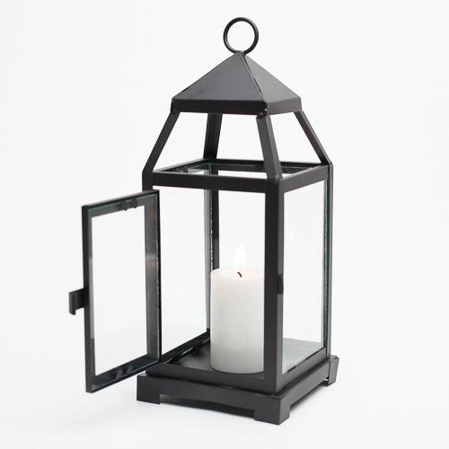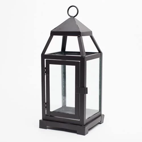 In love with Lanterns! This peaked contemporary matte black metal lantern is such a great size and fit for most any occasion. The sturdy base and easy to use metal latched door lend to the security of the flame inside! The lantern comes with clear glass panels for the sides; and the hitched peak has open space for the heat of the flame to escape. With the small addition of the metal ring atop the peak, this lantern can easily be a hanging lantern as well. Simple assembly required.