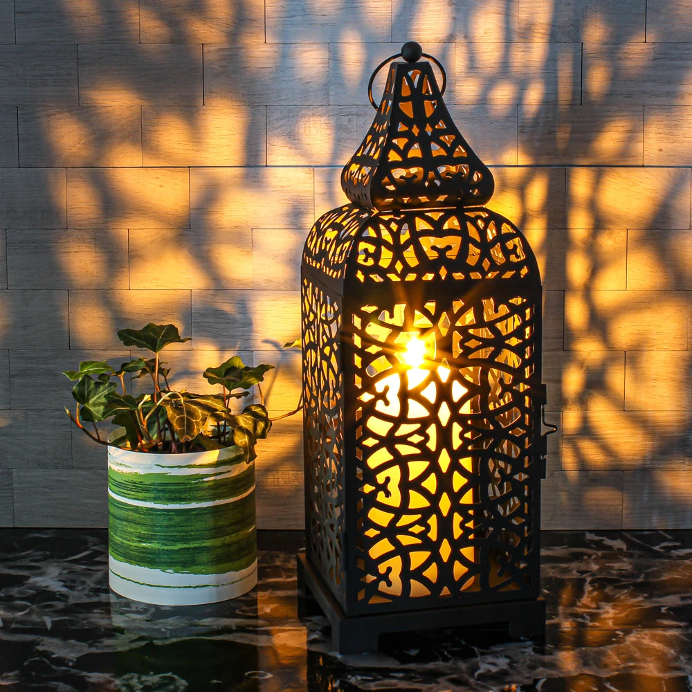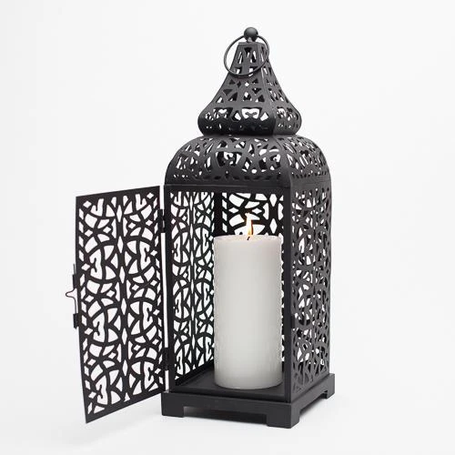 This amazing and stately Moroccan lantern adds intrigue to your space! The intricate Moroccan cutout designs within the metal lantern lend to the visual appeal. With the attached metal ring at the top of the peak, this product can be used as a hanging lantern as well. The latch slide door is easy to open and the inside is spacious for a Richland Pillar Candle. With a lit candle inside, the cut-out design not only allows the heat to escape from the lantern, the gorgeous glow that is created through it will leave your guests in awe. A great choice for home and event décor!