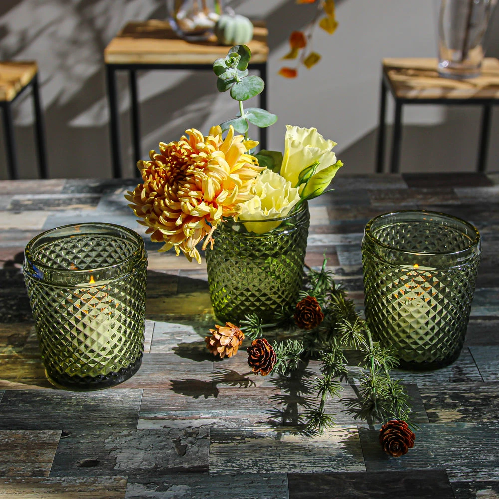 Brilliant! With a tealight or votive candle inside, the effect of candlelight through this olive green patterned holder is stunning. The raised diamond detail in the thick glass creates a different ambiance from angle to angle that everyone will love – great for special events, restaurants, and in the home! Fill with your favorite flowers for a charming flower vase!
