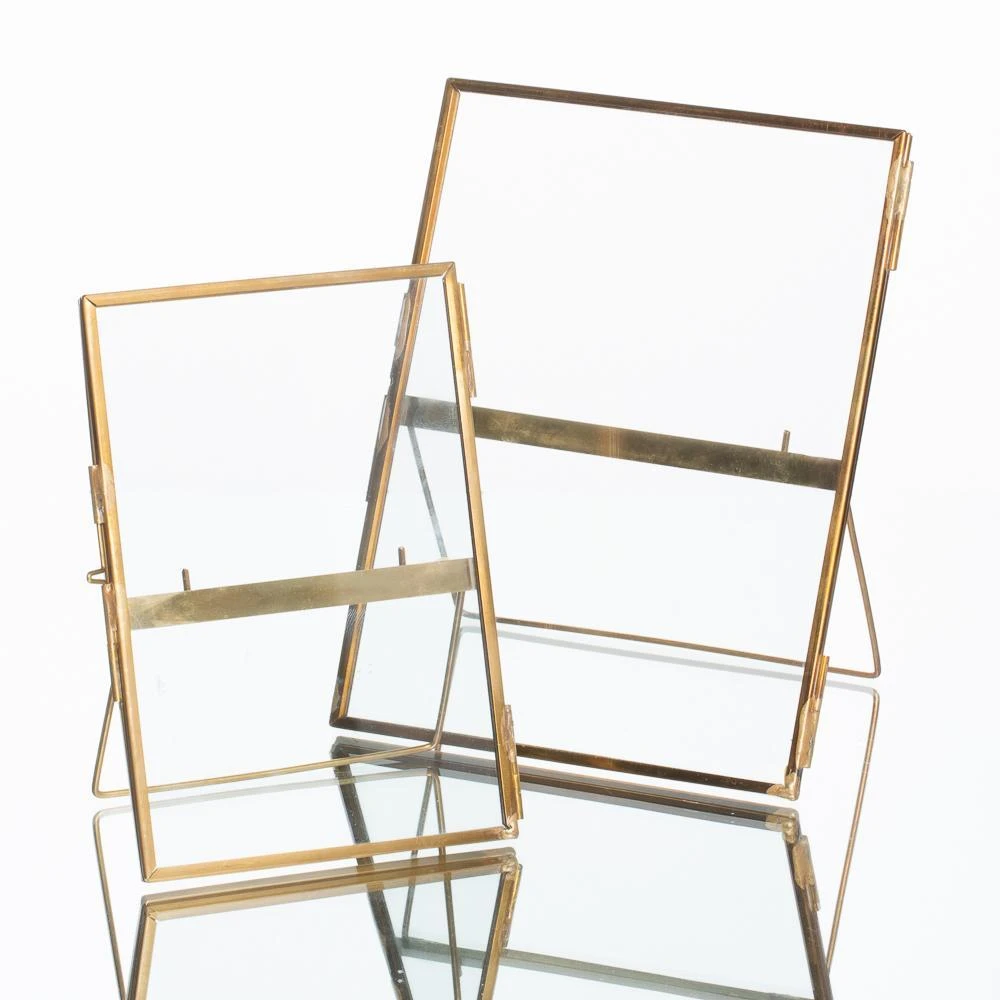 Frames hold treasures! Our Richland glass photo frames are the perfect spot to place your special memories. With two pieces of glass to press pictures, flowers, or other keepsakes, our frames fit the bill. This frame boasts a perfect stand that makes for easy placement. The beautiful dusted gold metal frame adds to the finished look. This piece is distressed for vintage charm. Perfect for home and event! Two total frames included in the set – one of each size.