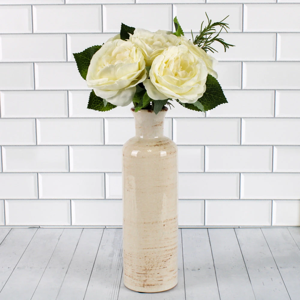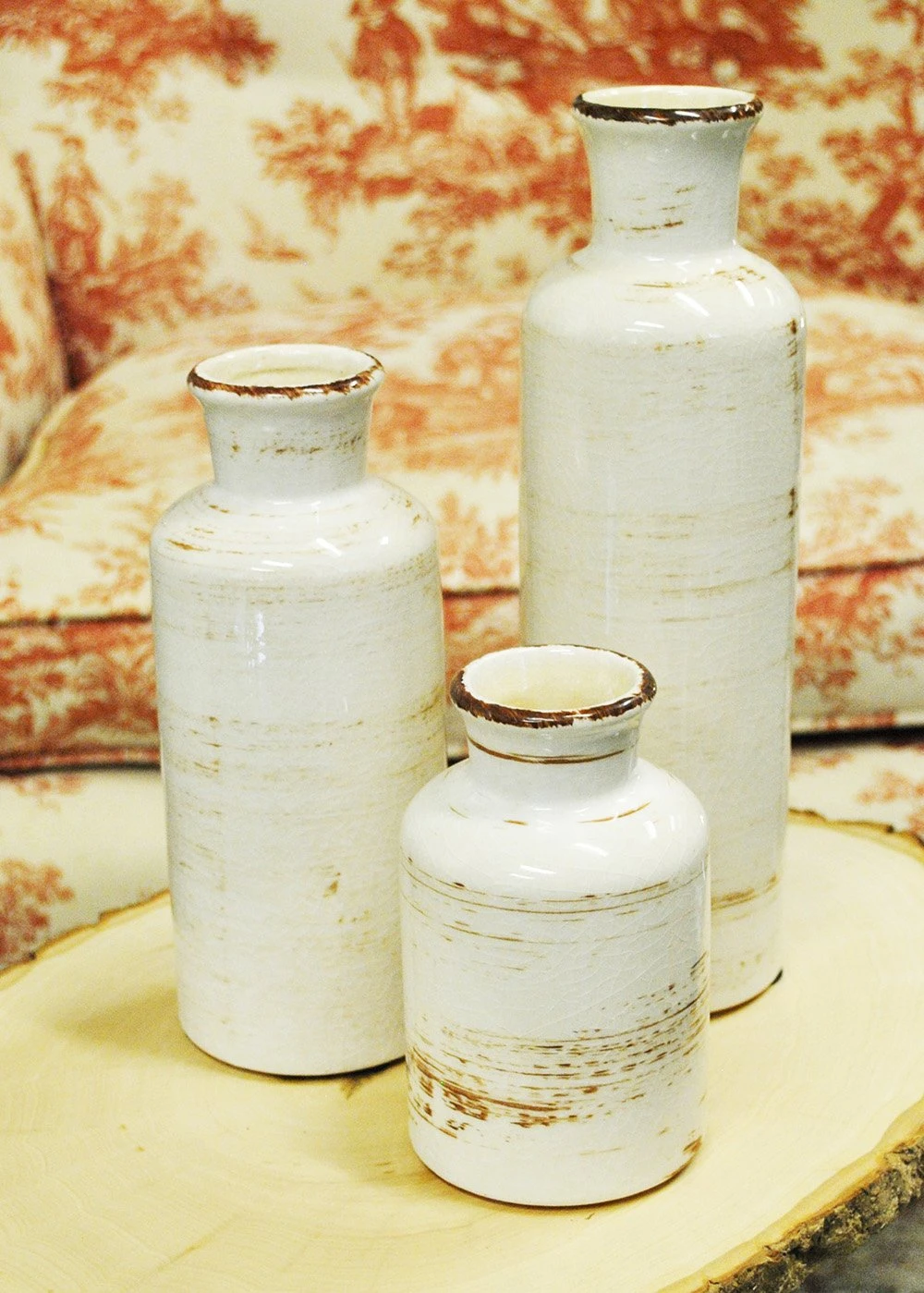 These boho-chic vases are perfect for adding an almost vintage touch to your space! The creamy white vases are perfectly distressed to give them texture and flair. Place this set on your mantle or table to add that gorgeous farmhouse feel. Each vase is hand painted so the design on each vase will vary. Just add your favorite flowers, greenery, or branches to create a charming display. This set includes four of each size vase – mix and match to create amazing looks!