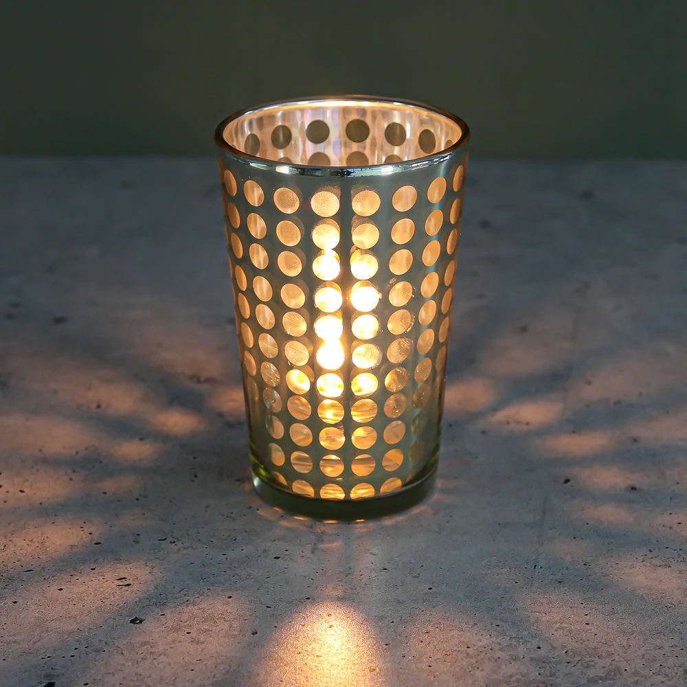 Metallics are in! Our fabulous line of silver, gold, and rose gold metallic glass holders will make your home or event a little more magical. This tall and narrow holder features quality glass, a gold metallic dotted design, and elegant tapered shape. Add our Richland Votive or Tealight Candle options to complete your look (candles not included). Candlelight illuminates the holder, providing a captivating glow through the dots of the design.