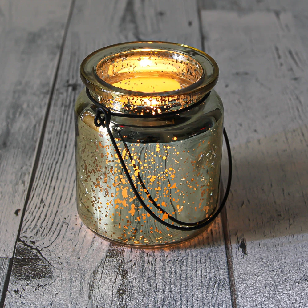 These fabulous hanging mercury glass holders can be just the right touch for your home or event! These thick glass vessels features a reflective dappled metallic finish, elegant shape, and brushed black metal handle. When using with our Richland Tealight or Votive Candles, the shimmer and glow through the speckled finish will brighten any spot! Perfect for weddings, events, and home décor!