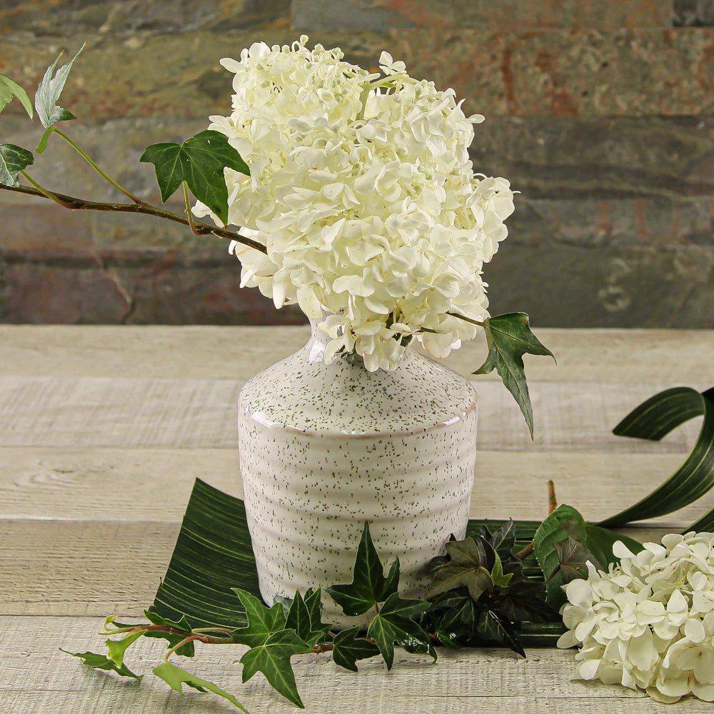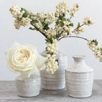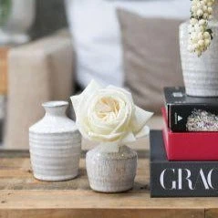 Beckoning the feel of a peaceful mountaintop retreat, this small white glazed ceramic bud vase has a stone-inspired texture that adds a touch of serenity to any setting. The organic feel and elegant shape of this piece makes it perfect for displaying lush blooms, crisp twigs and reeds, or a rich succulent. Create inviting centerpieces by using the boho chic Hari Budvase in table centerpieces for an event; or use as an effortless upgrade to your home and office décor.