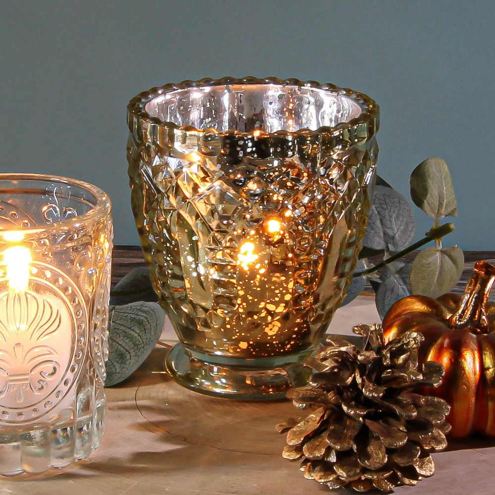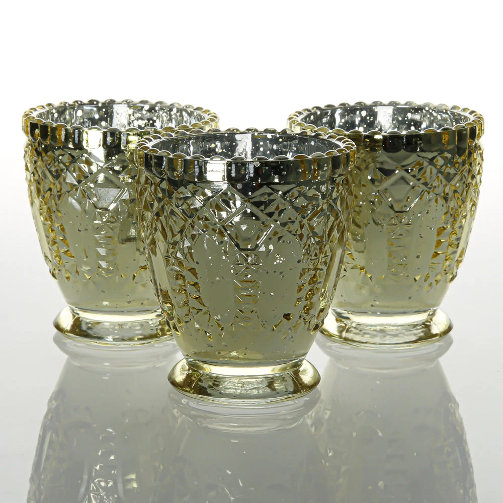 This royally-inspired glass holder has a intricate, detailed design and glimmering metallic gold mercury finish that makes this piece a must-have for home or event! The glass beading detail on the rim of the holder leads into a lovely tapered-shape textured body and elegant base. Once a candle is placed inside and lit, the glow through the shining dappled finish is breathtaking! Metallic Gold outside, silver on the inside. A perfect choice for weddings, dinner parties, restaurants, and upscale décor!