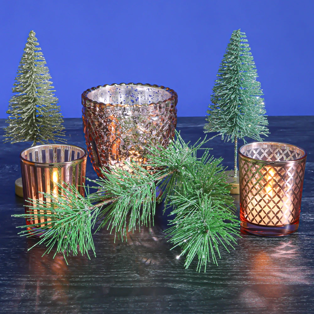 This royally-inspired glass holder has a intricate, detailed design and glimmering rose gold mercury finish that makes this piece a must-have for home or event! The glass beading detail on the rim of the holder leads into a lovely tapered-shape textured body and elegant base. Once filled with a candle, the glow through the shining dappled finish is breathtaking! Rose gold outside, silver inside. A perfect choice for weddings, dinner parties, restaurants, and upscale dĂ©cor!Â