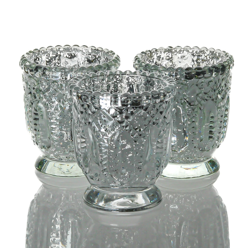 This royally-inspired glass holder has a intricate, detailed design and glimmering silver mercury finish that makes this piece a must-have for home or event! The glass beading detail on the rim of the petite-sized holder leads into a lovely tapered-shape textured body and elegant base. Once filled with a candle, the glow through the shining dappled finish is breathtaking! A perfect choice for weddings, dinner parties, restaurants, and upscale décor!