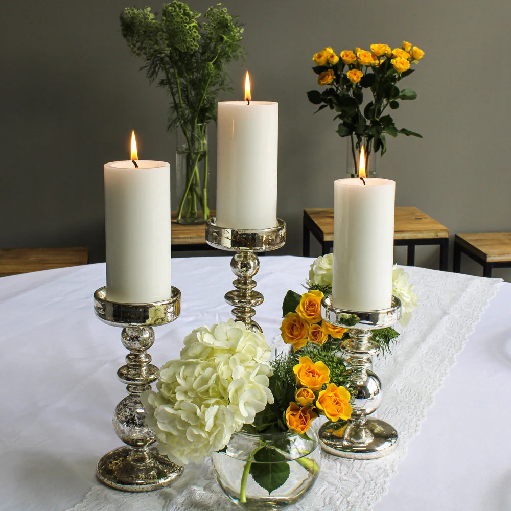 This fabulous Richland® Pillar Candle Holder Unique Mercury Bubble is the perfect pedestal for pillar candles! From the curves and edges from bottom to top and the bubble design, this candle holder provides flair to any setting. The dappled, reflective mercury finish and handmade delicate glass adds to the uniqueness of each piece. The top of the holder has a dropped lip to hold the pillar candle securely in place. The metallic finish is designed to work with many shades of metallics. An excellent choice for Weddings, Events, and Home Décor!