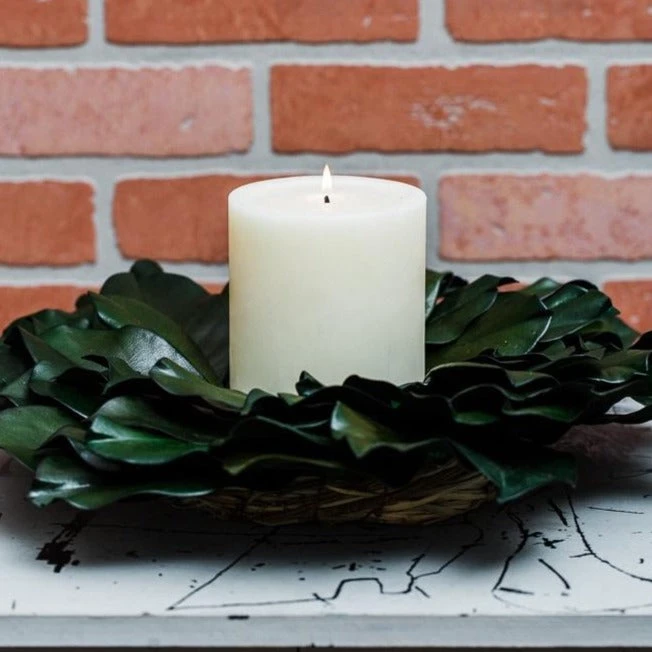 Size: Approximately 17″ diameter. The inner hole can accommodate a 4″ wide candle. This wreath is made with real magnolia leaves – natural variations and imperfections are characteristic.