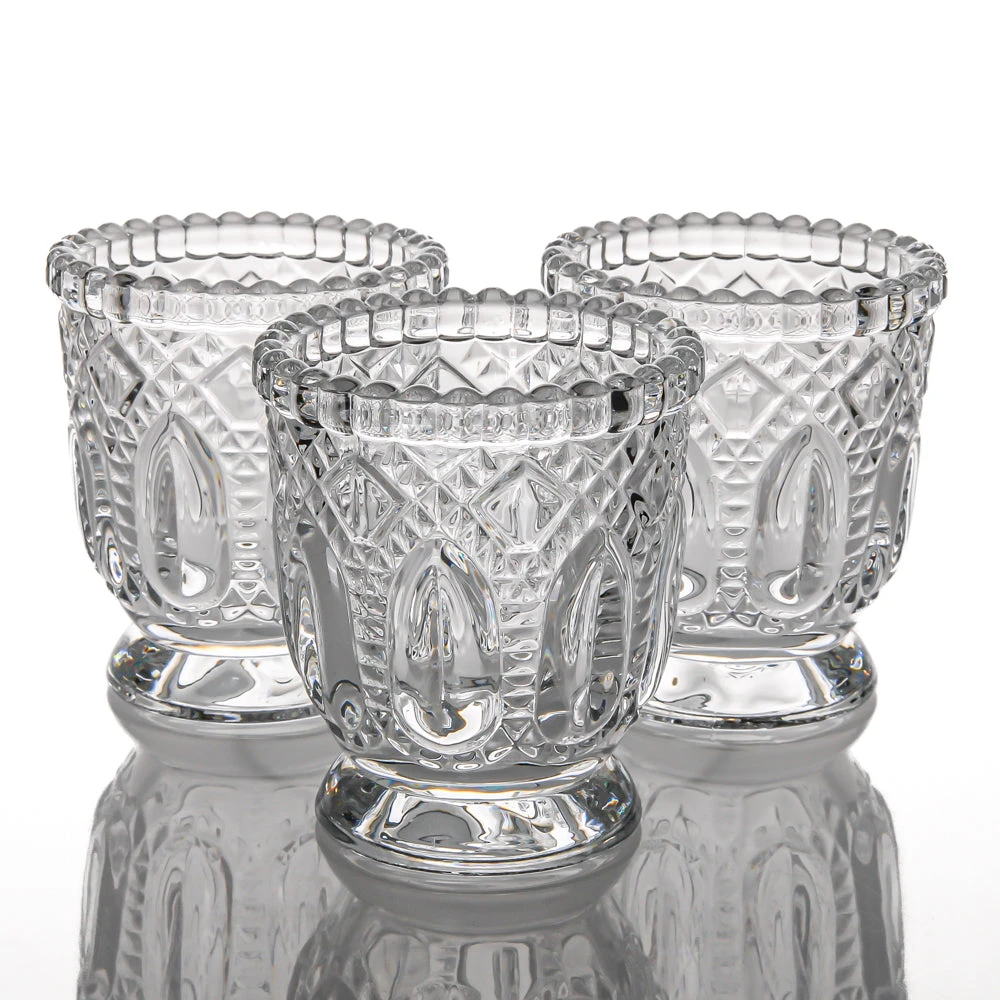 A smaller version of a customer favorite! This regal and romantic holder with beaded edge gives you a glimpse of a vintage tea room. The raised textured facets of the glass beckon the feel of jewels. With these many angles and shapes in the design and thick base, candle light dances about and creates a lovely ambiance. This beautiful royal holder is an excellent choice to add some glamour at a Wedding, Restaurant, Event, or Dinner Party!