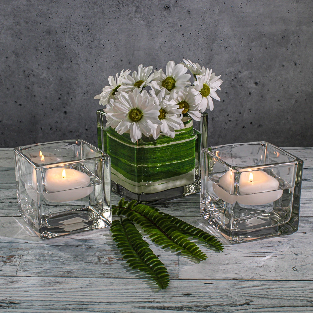 Being square is really cool with our glass cube vase collection! This premium quality cube is made of beautifully crafted thick clear glass; and features a very sturdy sham at the bottom that adds to the dimension and look. With the dramatic effect of the modern angles, and your addition of fresh flowers, succulents, greenery, candles, or vase fillers, this versatile vase provides endless possibilities for your décor!