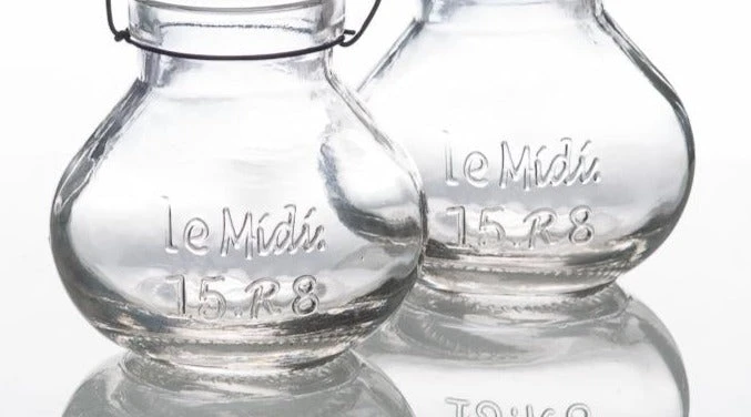 A perfect hanging mini vase! This petite thick clear glass vase with simple raised etched text provides the perfect vintage flair. This adorable jar features a curved shape a simple, sturdy black metal handle that allows you to hang it anywhere you like. The text on the little jar reads: Le Mídí 15.R8