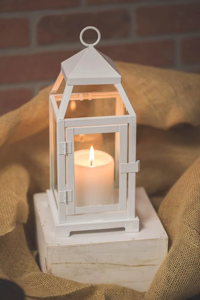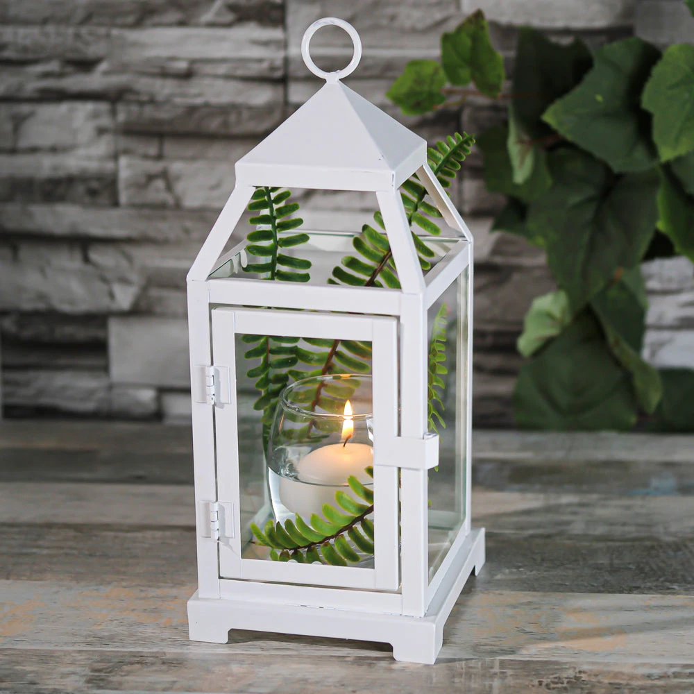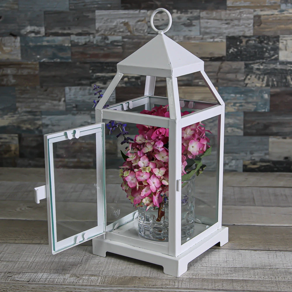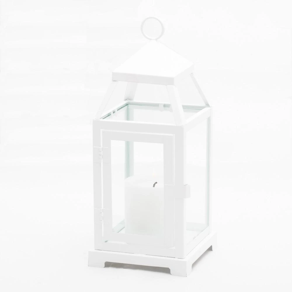 Wonderfully White! This peaked contemporary metal lantern is such a great size and fit for most any occasion. The sturdy base and easy to use metal latched door lend to the security of the flame inside! The lantern is painted a glossy white, comes with clear glass panels for the sides, and has a hitched peak with open space for the heat of the flame to escape. With the small addition of the ring atop the peak, this lantern can easily be a hanging lantern as well. Simple assembly required.